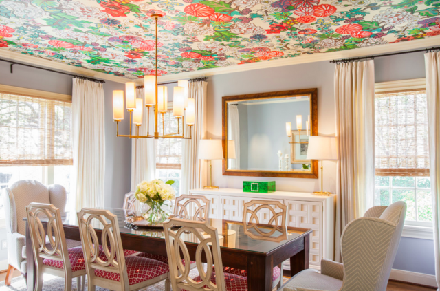 Выпускают специальные потолочные обои, которые отличаются рисунком (рассчитан на взгляд снизу, а не сбоку). Но можно клеить и обычные стеновые. При выборе нужно учитывать, что мелкий узор на таком расстоянии будет сливаться.