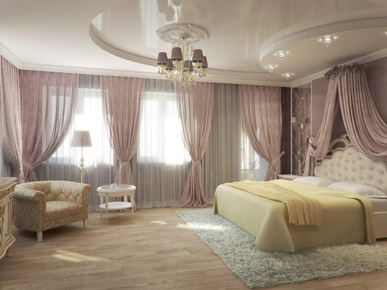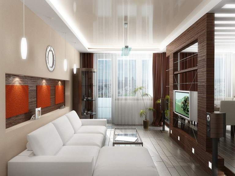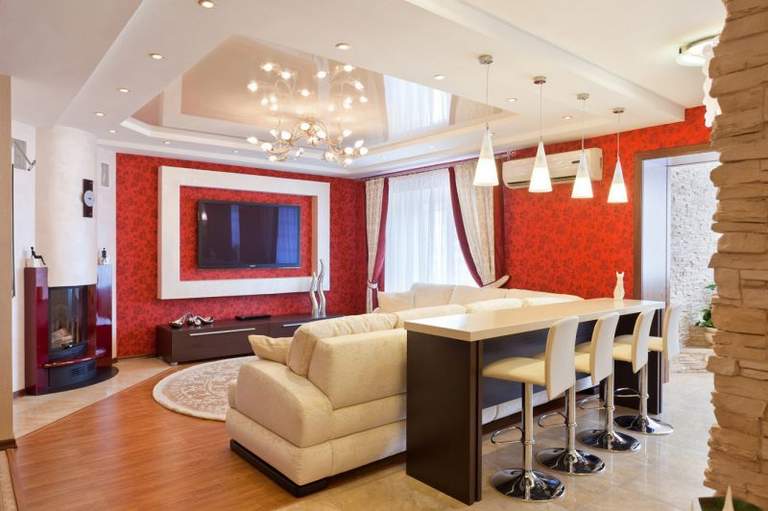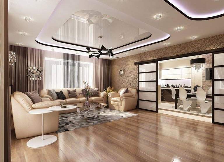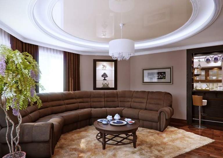Позволяет высота комнаты? Для гостинной подойдет многоуровневый потолок, сочетающий в себе разные оттенки бежа. Наш выбор — расходящиеся круги, спускающиеся от центра. Его рекомендуем украсить красивой люстрой округлой формы.