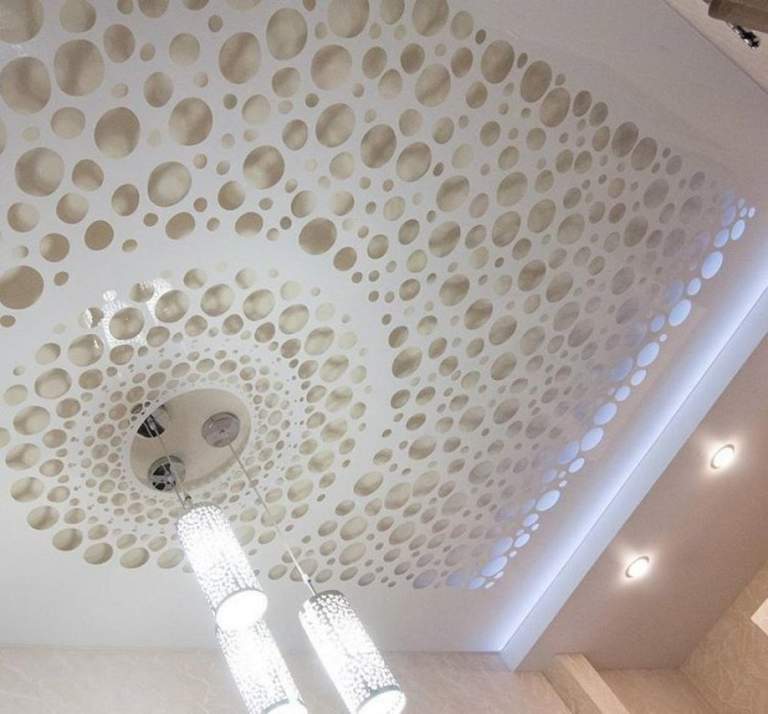 Бежевый может быть не только основным оттенком, но и выразительным цветовым акцентом. Поэкспериментируйте с перфорированными потолками — резные отверстия, открывающие карамельное полотно достаточно элегантно выглядят в любом помещении.
