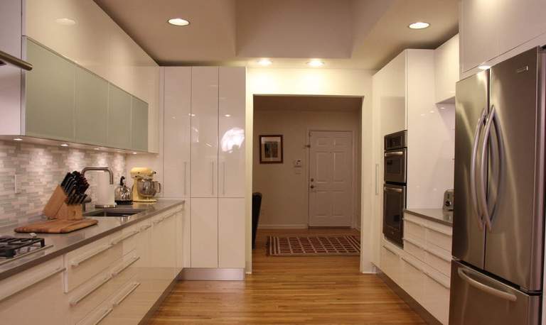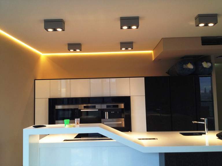 Подберите подходящие люстры, которые подчеркнут сложное переплетение линий, вмонтируйте в короб боковые точечные светильники — и вы удивитесь, насколько эффектно может выглядеть такое незамысловатое на первый взгляд решение.