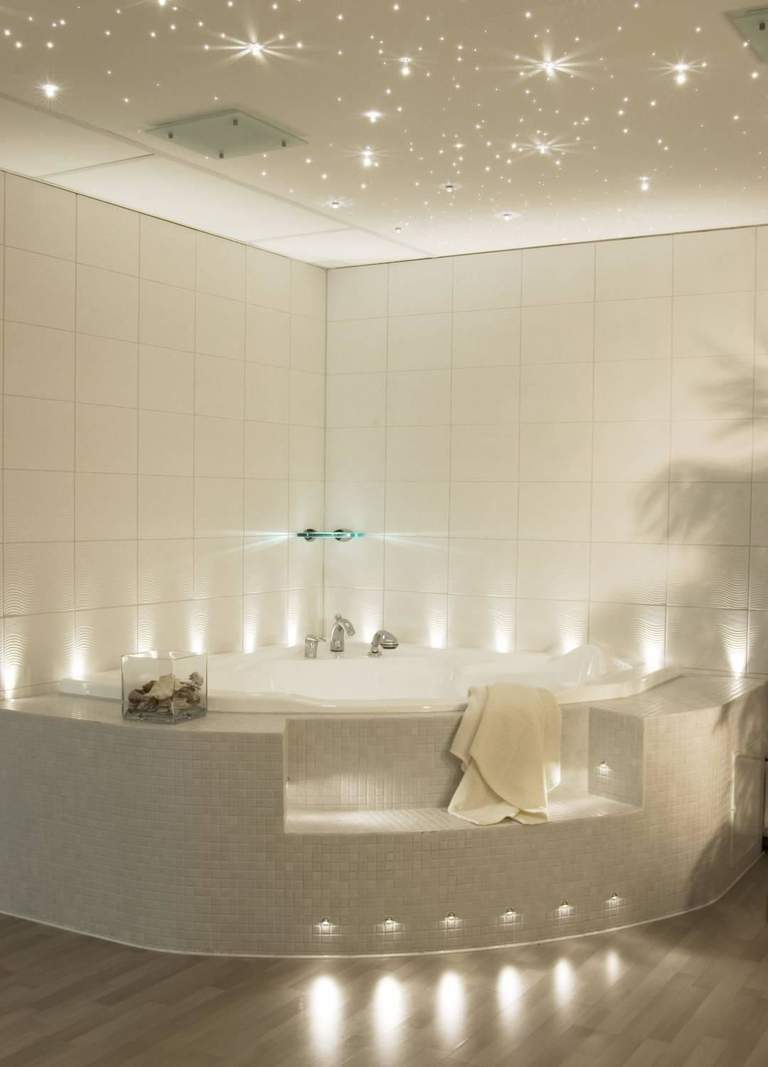 Тщательно продумайте расположение точечных светильников и светодиодных лент, скрытых за покрытием. Теперь, когда вы включите свет, ваш потолок превратится в мерцающее сегментированное полотно, объемное и очень красивое. Правда, без дополнительных источников освещения не обойтись — лучше выбирать простые лаконичные люстры, не привлекающие внимание.