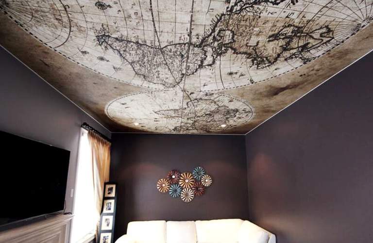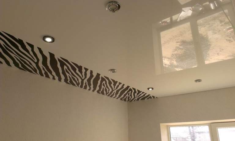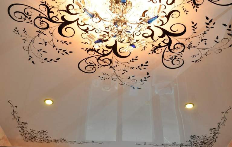Использование термо-печати позволит значительно увеличить количество возможных вариантов дизайнерского оформления натяжного потолка. Не обязательно заказывать принт на все полотно — вы можете использовать небольшие вставки.
