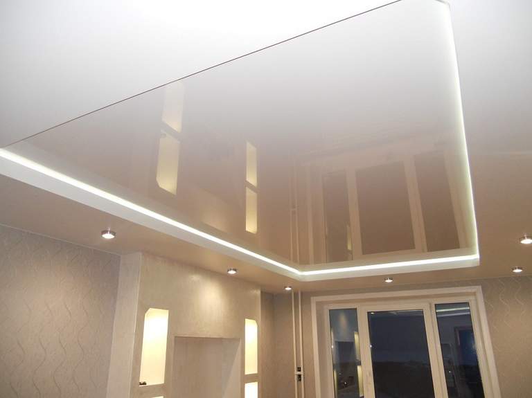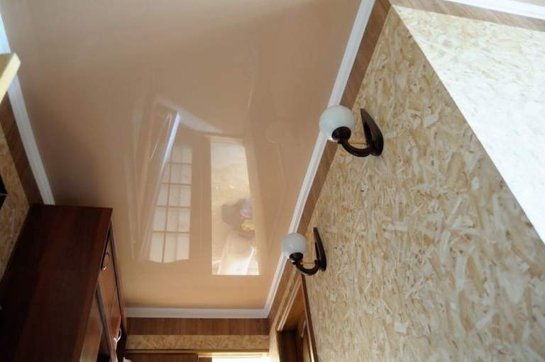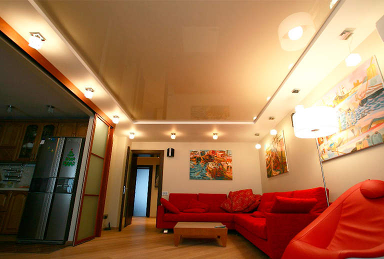 Глянцевые натяжные потолки благодаря фактурному блеску выглядят самодостаточно и не нуждаются в дополнительных украшениях. Если вы выберите основным цветом нежный бежевый оттенок, то можете отказаться от плинтусов и люстр сложной формы — достаточно нескольких вмонтированных точечных светильников среднего размера.