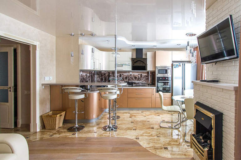 Еще один плюс такого дизайна потолка — возможность сочетать его с любым оформлением стен и пола. Он смотрится достаточно элегантно, не отвлекая на себя основное внимание.