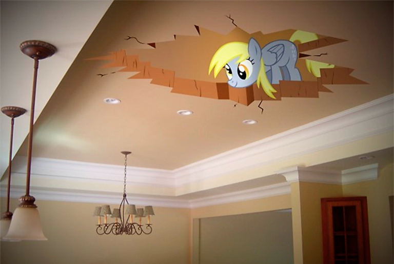 Для детской можно подобрать и более яркий вариант. Как ваш ребенок отнесется к любимому герою мультика, выглядывающему в пролом на потолке?