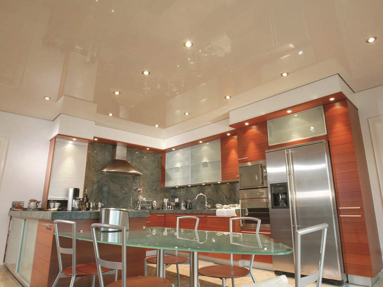 Подобный вариант подойдет и для кухни. Натяжные потолки просты в уходе, поэтому вам не придется тратить много усилий на уход. А точечные светильники проще протереть, чем фигурные люстры.