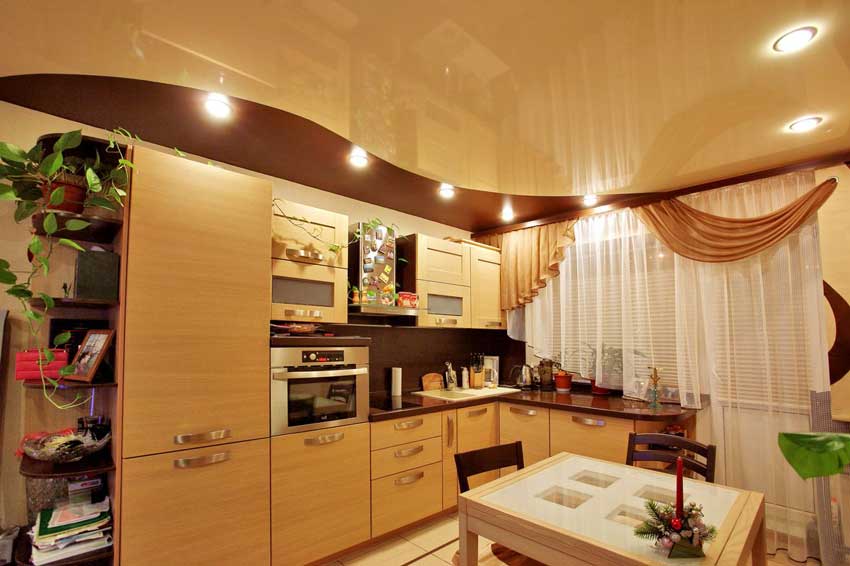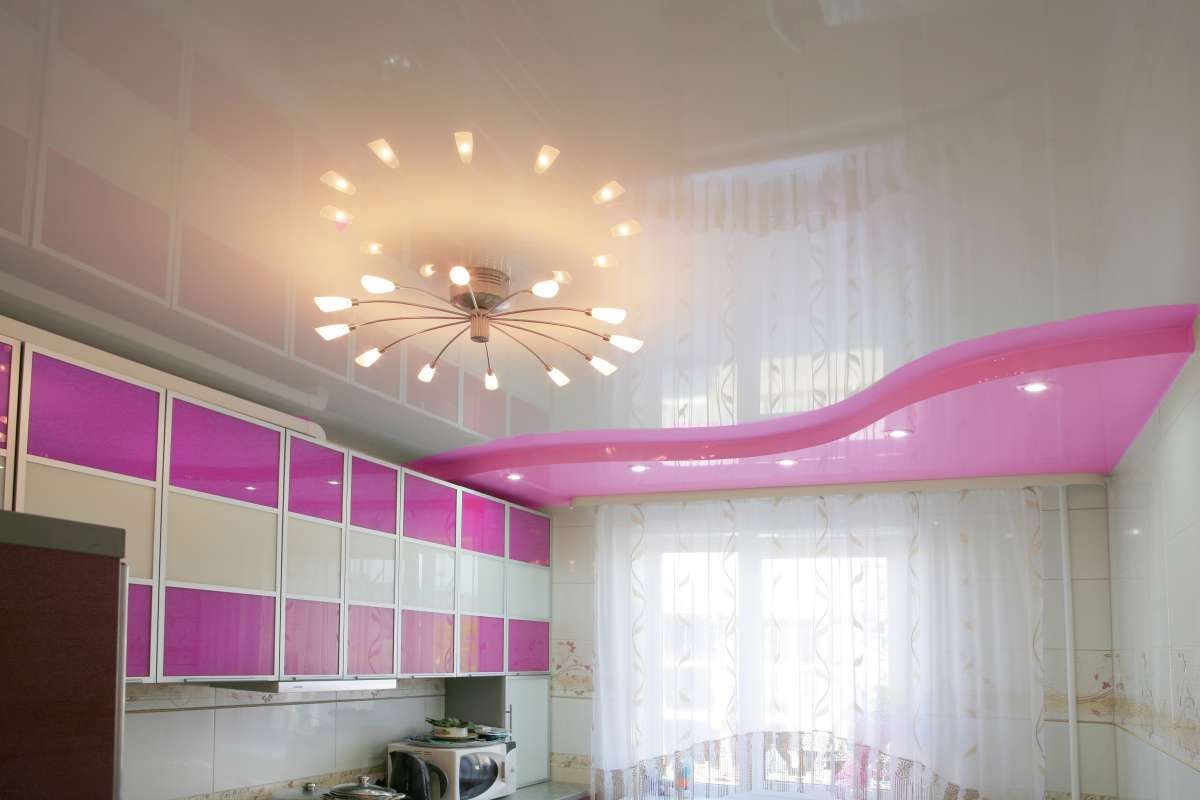 И даже, если у вас электроплита, всё равно лучше выбрать глянцевое полотно. Жир, влага, пыль, брызги… Всё это будет оседать на потолке и отмыть его будет совсем непросто.