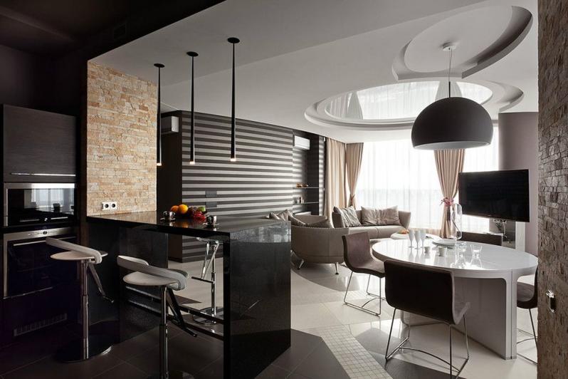 В гостиной можно монтировать любой потолок, ориентируясь только на визуальные ощущения. В этой комнате никто не спит и сильно долго не находится. Поэтому, если вам нравится глянцевый блеск – ставьте.
