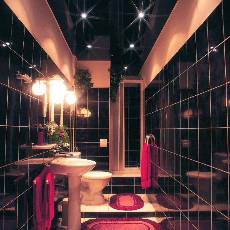 Как вы помните, глянцевые полотна способны визуально увеличивать помещение, поэтому, для маленьких ванных комнат это вполне разумный выбор.