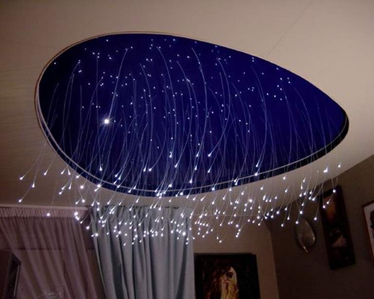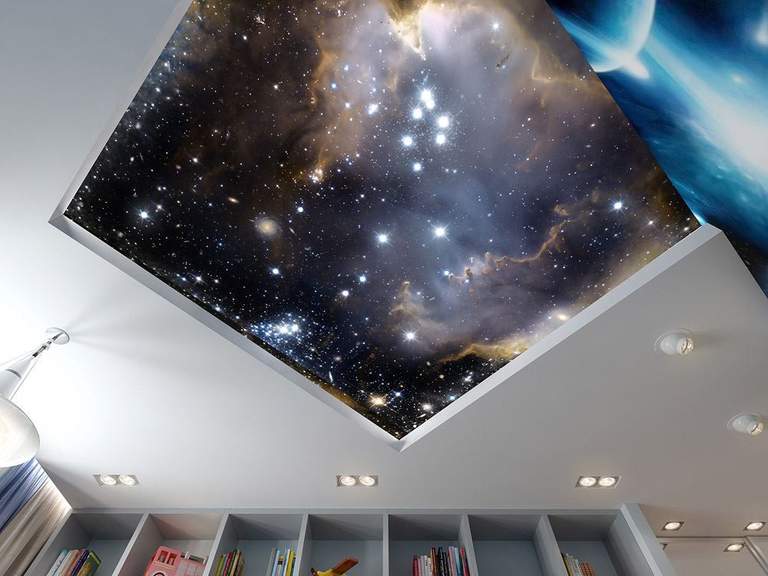 Особенно эффектно такой прием выглядит на темных глянцевых вставках. Чаще всего этот метод используют для оформления детских или спален. Если же вы хотите удивить своих гостей — попробуйте разместить такой потолок в гостиной.