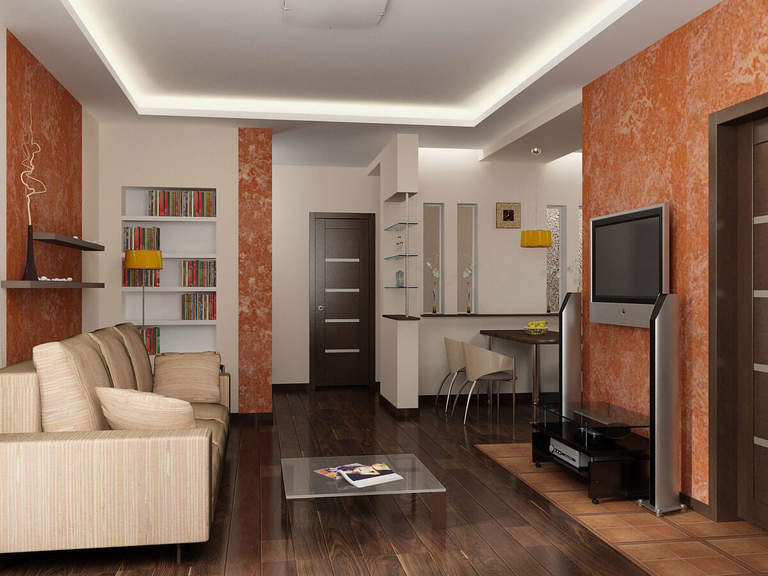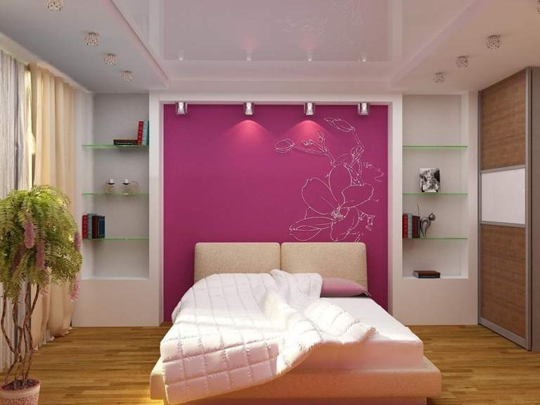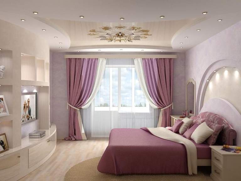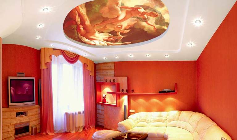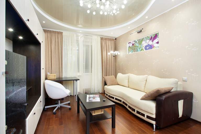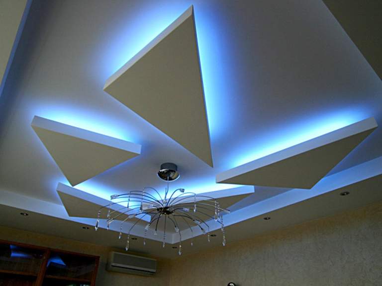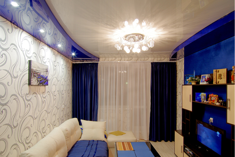 В маленькой же комнате красиво будет смотреться один выступающий круг или прямоугольник. Подсвеченный по периметру, он визуально расширит комнату, добавит ей света и объема.