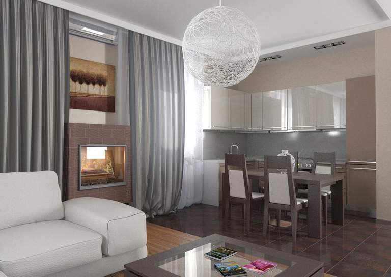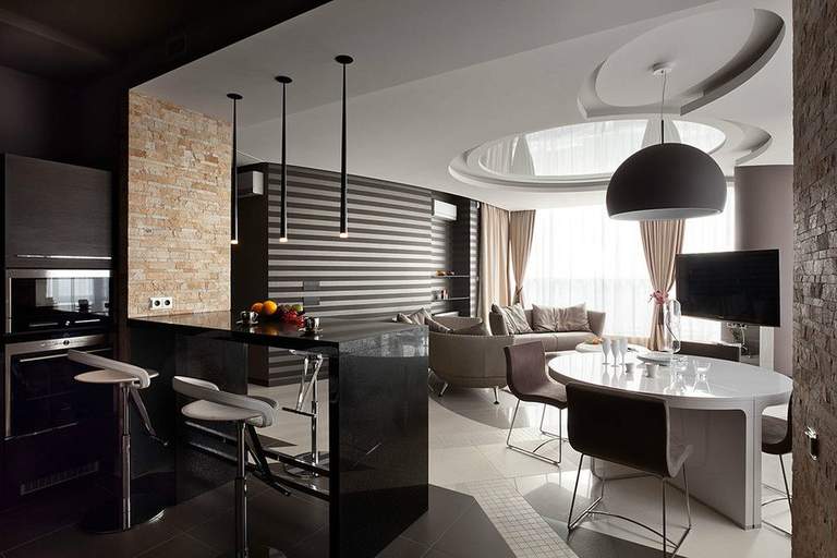 Эффектно выглядит и комбинированный метод подсветки — центральный источник освещения в сочетании с небольшими лампочками для подсветки определенных зон. Чаще всего такое освещение используют в гостинной или на кухне.