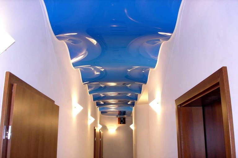 Использование фотоэлементов в натяжной части конструкции поможет также создать эффект примятого или волнообразного потолка. Выглядит это достаточно необычно, небанально и привлекает внимание. Но такой дизайн подходит не для всех помещений. Лучше или добавлять такие элементы точечно, или использовать в просторных помещениях.