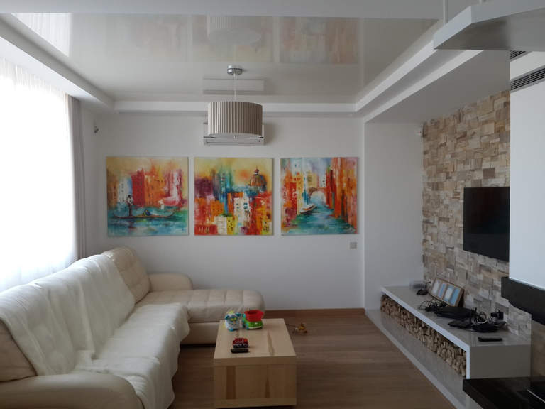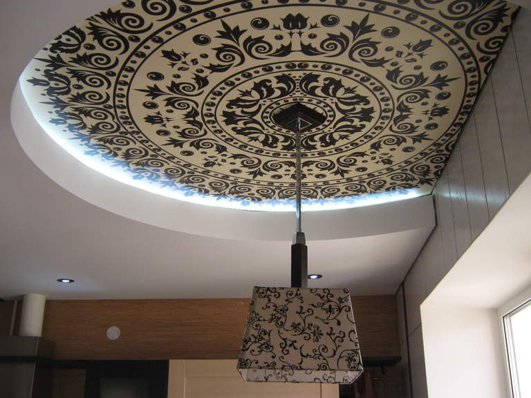 Оригинально выглядит натяжная вставка с фотопечатью. Такие натяжные элементы стоят дороже обычных, однако смотрятся чрезвычайно эффектно. Вы можете выбрать любой узор: цветы или животные, абстракция, облака, полотна художников. Лучше всего такие элементы выглядят на фоне однотонного потолка, бежевых и светлых оттенков.
