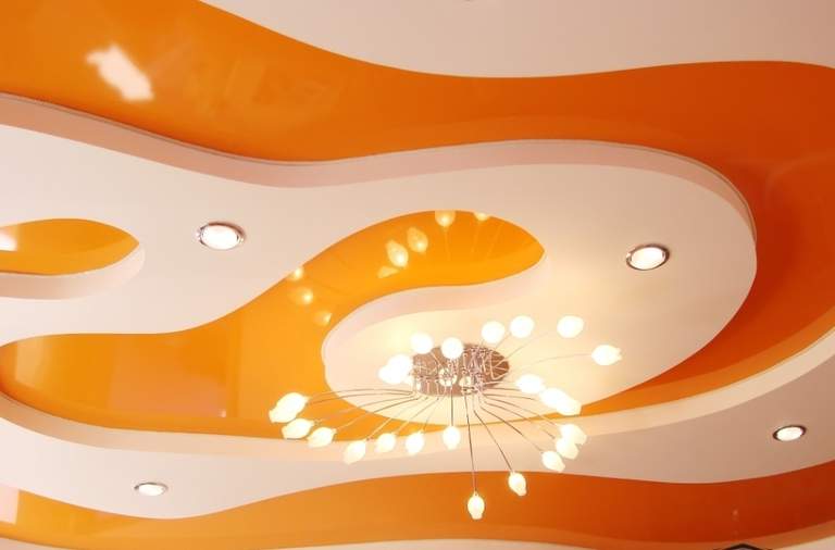 Для двухуровневых комбинированных потолков эффектно смотрятся выступающие гладкие глянцевые завитки на матовом фоне. В этом случае вы достигните приятного визуального эффекта в любом случае: или если решите сыграть на разнице фактур при использовании одного цвета, или же если остановите выбор на двух контрастных цветах.