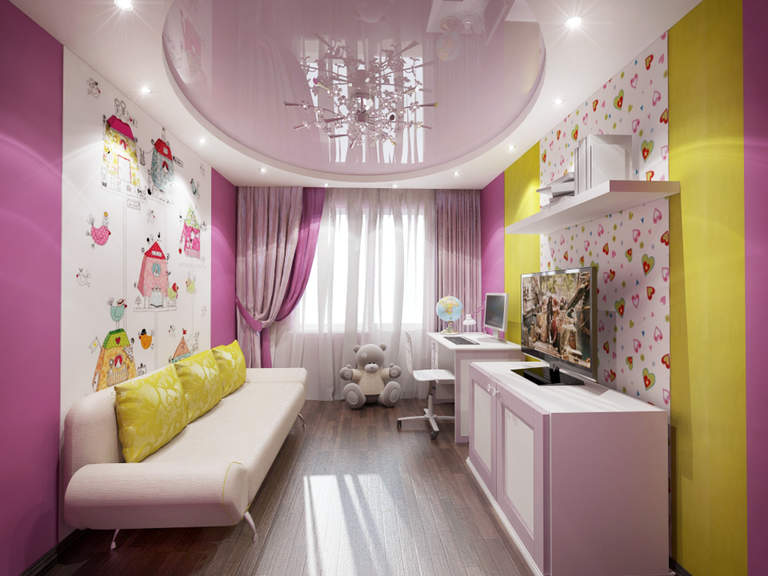 В качестве подвесной конструкции вы можете выбрать любые детали: цветы, геометрические фигуры, буквы. Единственное, что нужно запомнить — такой прием снижает визуальную высоту помещения, поэтому будьте осторожны в комнатах с низкими потолками.