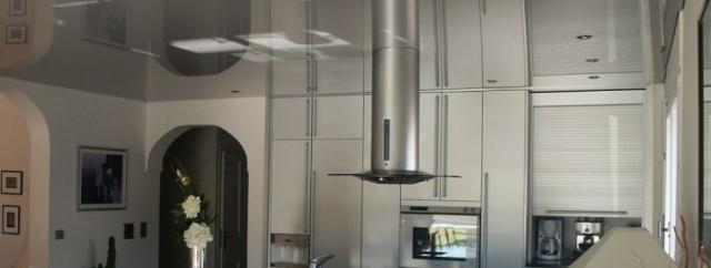 Самый простой вариант – кухонная система, устанавливаемая под навесной шкаф. Она плоская и к потолкам практически не имеет отношения. Поэтому, случаи установки таких агрегатов рассматривать нет смысла. Намного важнее понять, как сделать вытяжку непосредственно под натяжным потолком и при этом, ее функционал должен быть полным, а полотно не должно получить повреждений. Такие устройства можно разделить на две категории:
