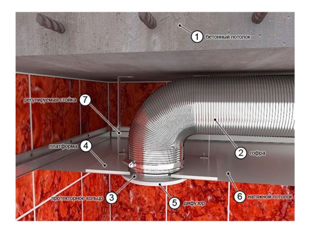 Далее все зависит от типа монтируемого устройства – для потолочных вытяжек нужно просто установить их и закрыть декоративной решеткой. С кухонными вытяжными устройствами немного сложнее. От них идет довольно горячий воздух, который может расплавить полотно. Поэтому, требуется дополнительная защита.