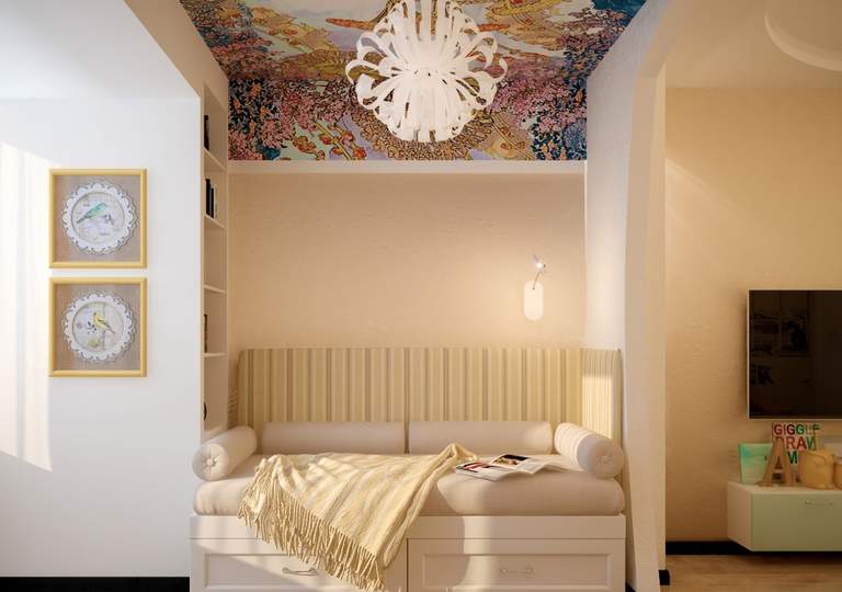Целостность интерьера можно подчеркнуть и при помощи декора: как вам картина, визуально отражающая потолок? С одной стороны, такое оформление нельзя назвать сплошным. С другой, создается впечатление полной гармоничности элементов.