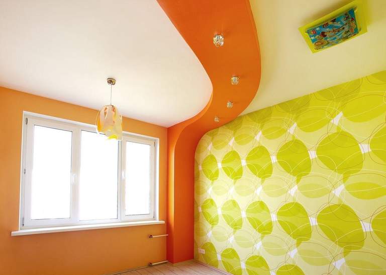 Фигурные элементы с применением натяжного полотна тоже не проблема. Совсем необязательно, чтобы элемент, переходящий на стену, должен быть плоским: рельефность позволит создать необычный эффект, привлекающий внимание.