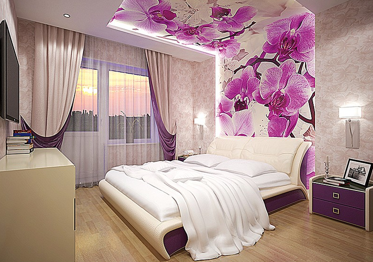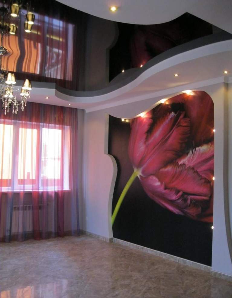 Натяжные потолки, спускающиеся на стену, с фото, напечатанным на материале, кардинально поменяют ваше представление о принтованном полотне. Да, и одноуровневое покрытие, оформленное таким образом, производит впечатление.