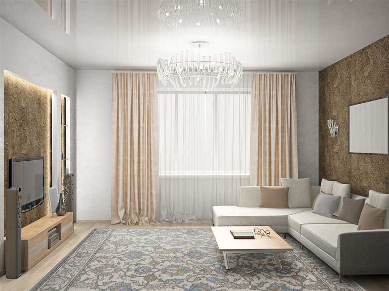 Согласны, это будет стоит вам 10 см от первоначальной высоты. Но если вы расположите первый глянцевый уровень в средней части потолка, а второй матовый уровень — по периметру, то это будет мало ощутимо.