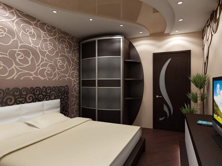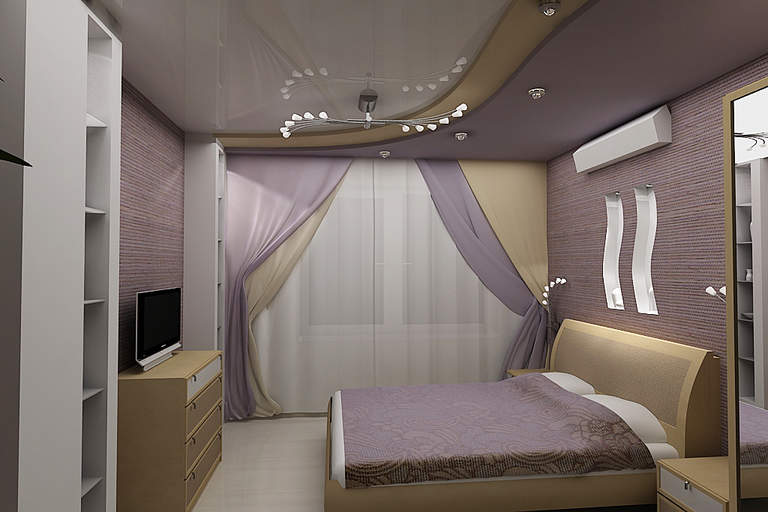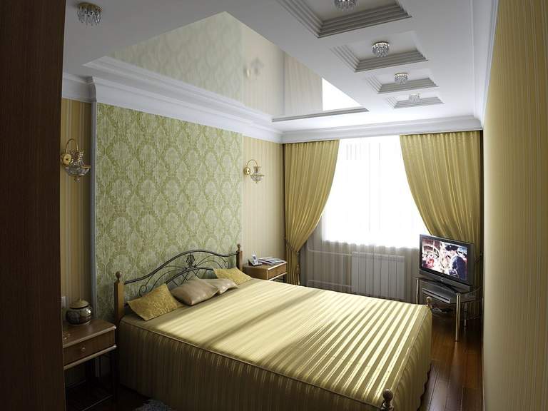 Двухуровневые или комбинированные потолки в этом случае дают больше возможностей – внутренняя часть потолка, занавески или элементы на стенах или обоях могут быть одинакового цвета.