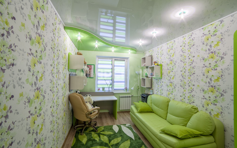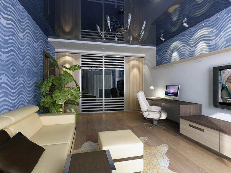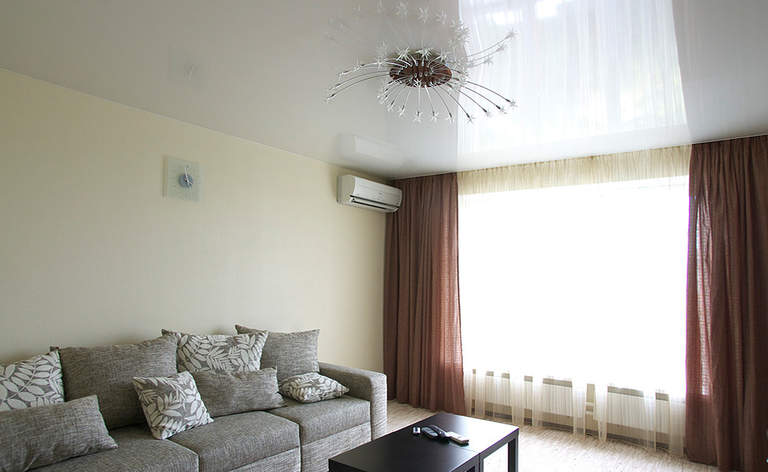 Если вам решительно не подходит глянцевый блеск, вы можете отдать предпочтение матовой поверхности, которая выглядит как обычная побелка. Но можно поступить и так: в коридоре, ванной, на кухне и в туалете применить матовую поверхность, а в зале и спальне использовать ткань или нанесенную на пленку фотопечать.