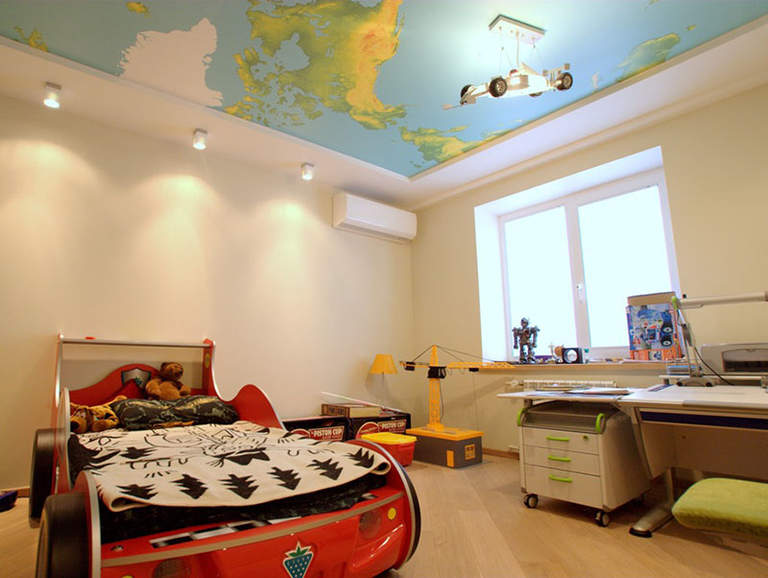 Изображение или фотография может занимать весь потолок, может быть расположено в углу или над люстрой. Вы выбираете уже готовый рисунок из каталога или наносите свой собственный. Учитывая небольшие размеры помещений, от изображений больших, громоздких объектов лучше отказаться. За сюжетом вы можете обратиться к любимой картине или фотографии, как и к собственной фантазии.