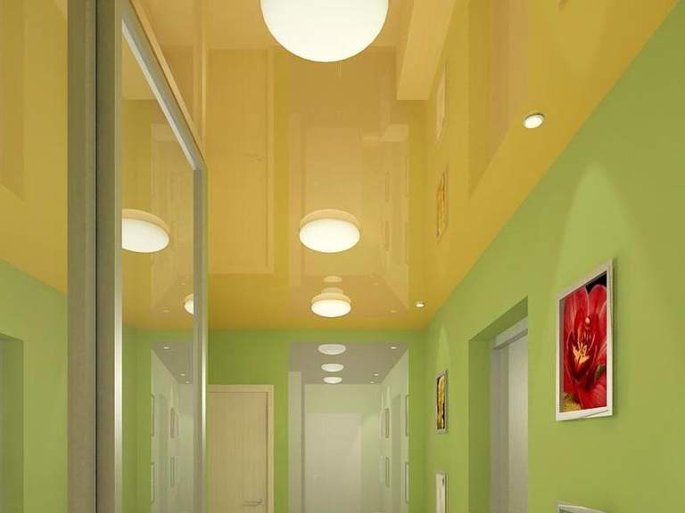 Как может выглядеть глянцевый натяжной потолок в прихожей, гостиной, в ванной или на кухне и как отлично он вообще смотрится в хрущевке, вы можете увидеть на этих фото.