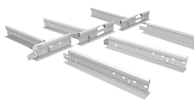 В несущих и длинных рейках предусмотрены слоты. В них вставляют вторичные элементы подвесного потолка. Они совместимы с любыми типами соединений. В профиле предусмотрен пожарный компенсатор температурных деформаций.