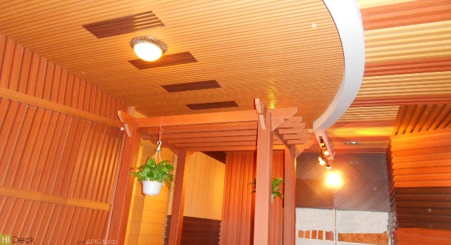 Использование ДПК – древесно полимерного композита в отделке самых разных помещений становится все более популярным. Этот материал намного превосходит по своим характеристикам обычное дерево и может использоваться в таких помещениях, где условия эксплуатации не позволят применить древесину. Например, из ДПК можно собрать потолок в беседке или на террасе.