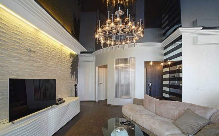 Комбинированный многоуровневый потолок с фигурной люстрой подойдет не всякой комнате. В первую очередь необходимо учитывать высоту стен — если они меньше трех метров, подумайте о менее громоздком варианте. Но если помещение позволяет — вы получите эффектный дизайн потолка. Сыграйте на разности матовой и глянцевой фактуры — это практически беспроигрышный ход.