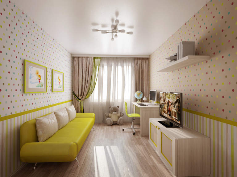 Современные технологии предлагают множество видов — от покрытий с рисунками, например, сюжетными картинами, до абстрактных узоров. Учитывая относительно небольшие габариты комнаты, предпочтительным будет второй способ. Все-таки слишком крупный узор визуально уменьшит комнату. Необходимо принять это во внимание, заказывая принт.