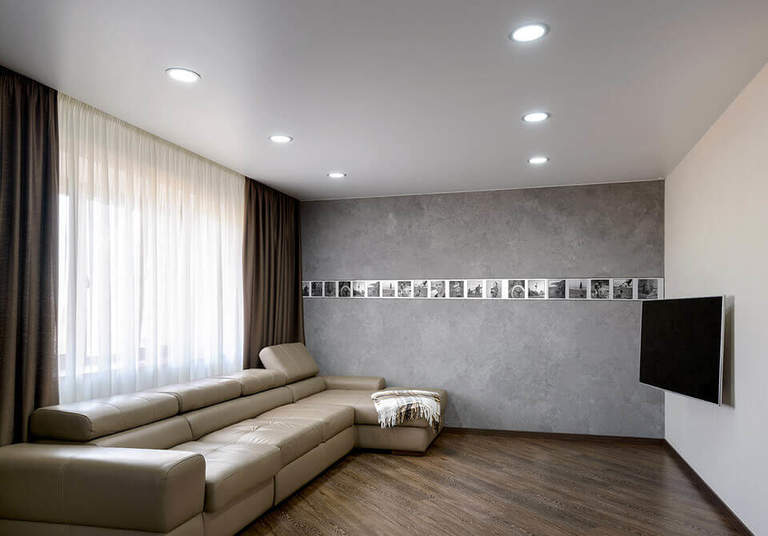 Необязательно делать однотонное покрытие. Комбинированный потолок с насыщенной вставкой — очень современное решение. Выберите цвет в тон обоям, чтобы гостиная была гармоничной. Кстати, обратите внимание, как ПВХ-пленка сочетается с текстилем и аксессуарами — отличный способ обеспечить целостность интерьера.