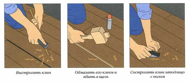 Подготовленные детали промазываются клеем и вбиваются в нужное место во всей длине дефекта. После того, как все клинья будут вбиты, поверх установленных деталей намазывается слой шпаклёвочной смеси или самостоятельно изготовленный раствор из опилок. Дальнейшие действия происходят после высыхания нанесенных составов и копируют действия предыдущих двух способов.