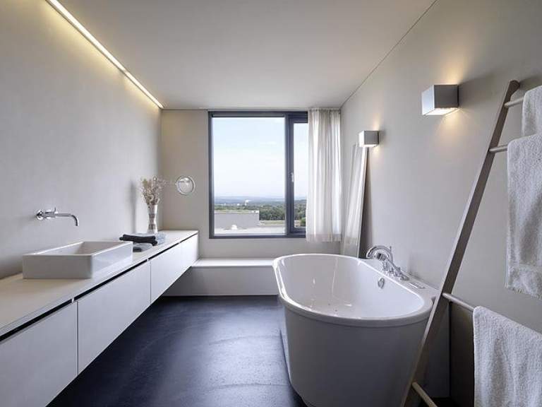 При оформлении ванной комнаты такое оформление пользуется большой популярностью — возможно, в силу сочетания гигиеничности и эффектного вида.