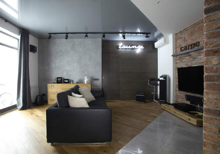 Кстати, кирпич — не обязательное условие. Натяжной потолок под бетон смотрится не менее впечатляюще. К тому же, ее можно украсить необычными рисунками. Матовое покрытие — то, что нужно чтобы подчеркнуть минимализм и четкость всех линий.