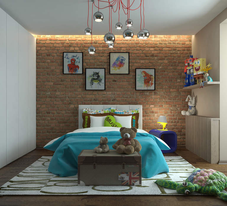 Даже комната маленькой принцессы в таком антураже вполне реальна. К тому же, кирпичная отделка стен очень напоминает настоящий королевский замок. Просто подберите симпатичные занавески и установите светлый натяжной потолок. Фактуру лучше выбрать глянцевую — она сгладит немного грубоватое впечатление остального интерьера. Правильные аксессуары помогут дополнить атмосферу.