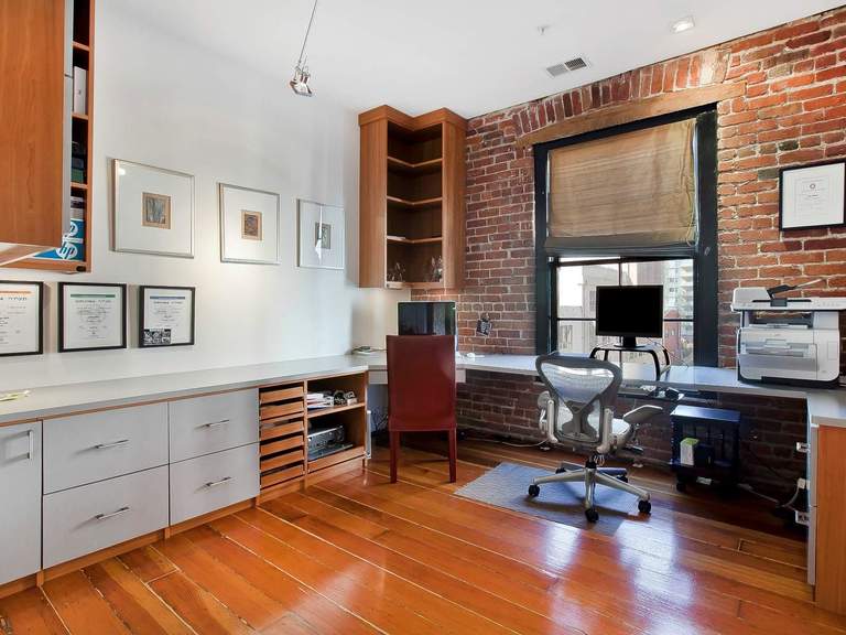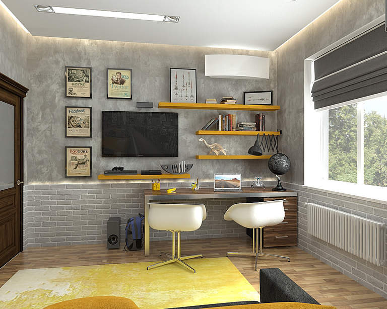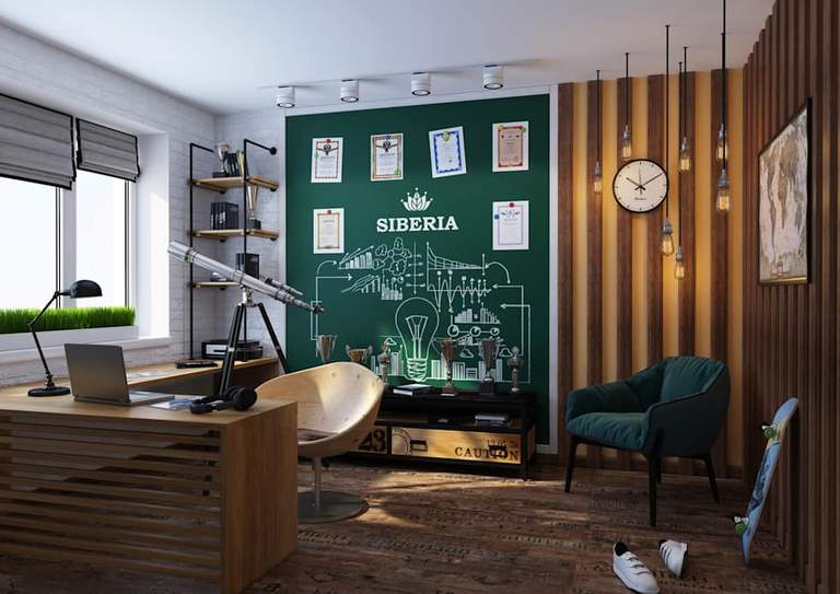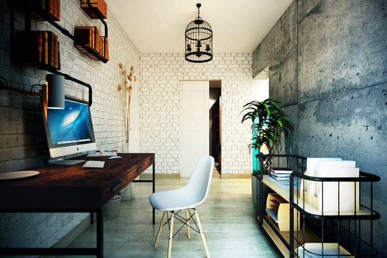 Парящий натяжной потолок — отличный способ придать кабинету немного эклектического стиля, который вполне сочетается с лофтом. Главное выбирать холодные тона светодиодной подсветки — теплые мало сочетаются с распространенными представлениями об урбанизме.