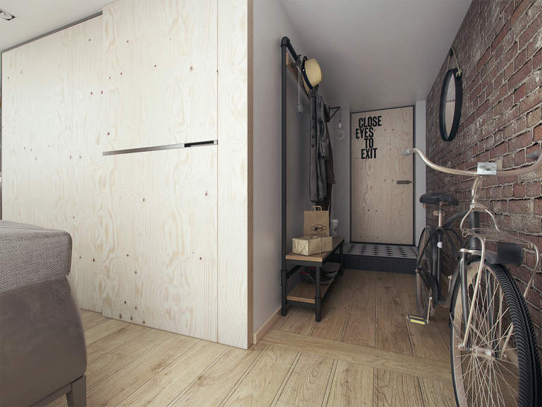 Для квадратных лофт-прихожих лучше сосредоточить внимание на стенах, а натяжное полотно выбрать матовое — оно подчеркнет стилистику помещения, но не оттянет на себя основное внимание.