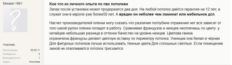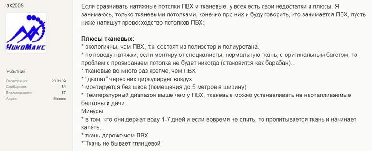 Теперь давайте посмотрим на реальные отзывы о ПВХ и тканевых натяжных потолках.