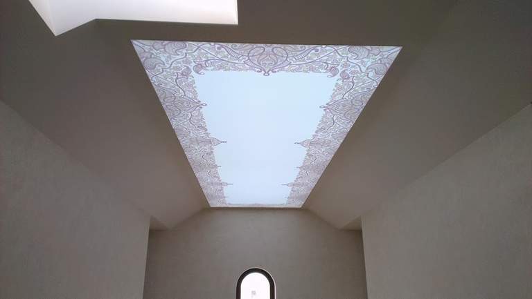 Узорчатое тканевое полотно — весьма смелый ход, поэтому позаботьтесь о соответствующем ему интерьере. Учтите, что ткань плотнее ПВХ, даже несмотря на перфорацию. В качестве подсветки следует установить светодиодные трубки — они мощнее и вы получите красивое мерцающее покрытие.