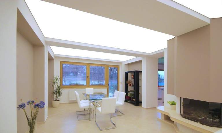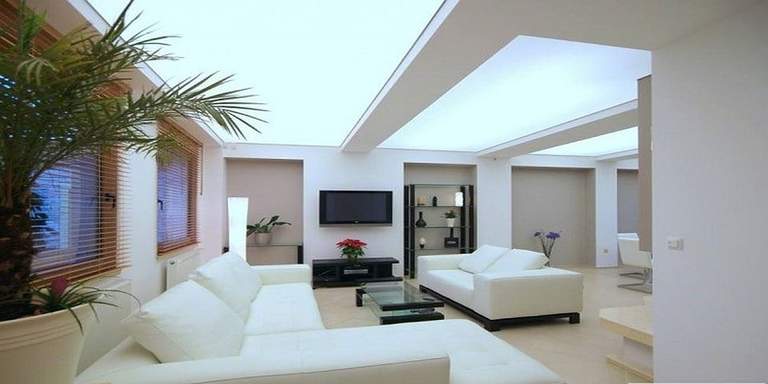- В зависимости от плотности и цвета, ПВХ-пленка может пропускать до 50% света. Она тоньше обычного натяжного потолка, но отличается всеми его достоинствами, включая и способность не пропускать воду (но выдерживает меньшую нагрузку);
