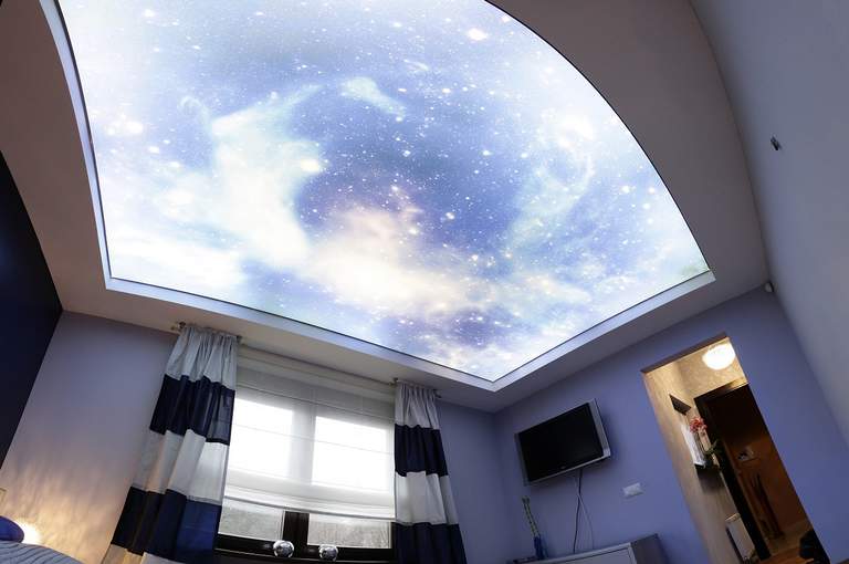 Равномерно светящийся натяжной потолок красив сам по себе. Но что делать, если вам необходимо замаскировать не слишком симпатичные стыки? Рекомендуем попробовать принты или виниловые наклейки. Они не только скроют дефекты полотна, но и послужат дополнительным украшением.