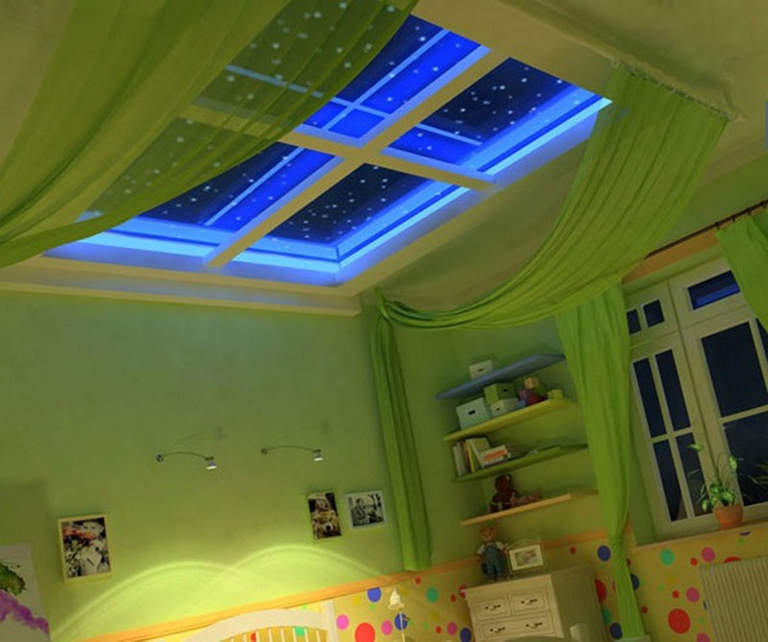 Любопытный вариант для детской комнаты — имитация окна на потолке. Тут сочетается сразу несколько технологий: полупрозрачный потолок со скрытой подсветкой, звездное небо (подробнее можно узнать здесь) и тонкие гипсокартонные балки. Конечно, назвать простым такой прием нельзя — вам придется приложить достаточно много усилий. Однако результат не оставит равнодушным никого, поэтому советуем попробовать.