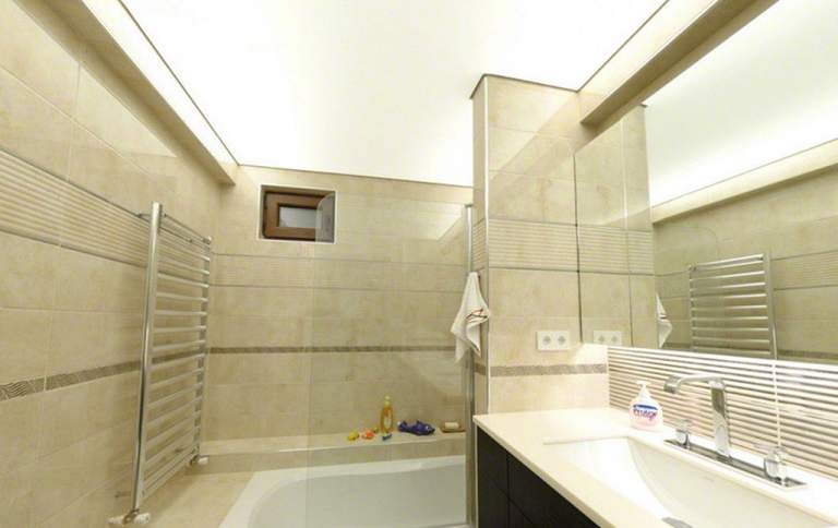 - Полупрозрачное полотно из ткани — не лучший выбор для ванной многоквартирного дома или для частного, где есть вероятность протечек. Фактура достигается за счет микроперфорации, поэтому герметичным такое покрытие назвать нельзя (хотя может быть вам именно такое и нужно?);