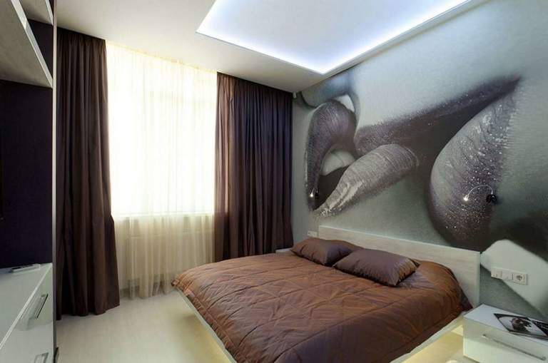 Если хотите чего-то уникального — яркая фигурная подсветка по нейтральному тону полотна. Такой своеобразный акцент понравится не каждому, но, несомненно, заслуживает места в нашей подборке хотя бы за свою оригинальность.