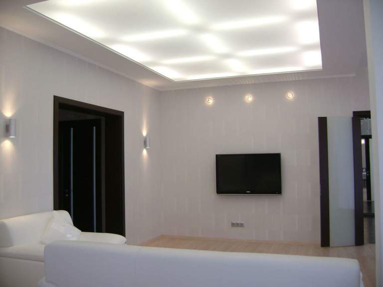 Яркое освещение тоже вполне реализуемо. Правда, на наш взгляд, лучше не пытаться таким образом подсветить все полотно. А вот две-три круглый вставки — то, что нужно!