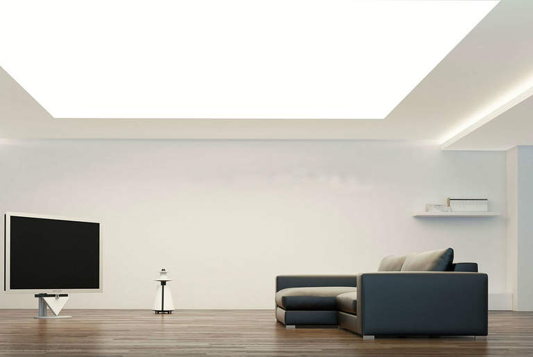 - Чем темнее цвет полотна, тем меньше света оно пропускает. Поэтому коричневый потолок будет едва заметно подсвечиваться, а белый обеспечит ровное и достаточно сильное освещение.